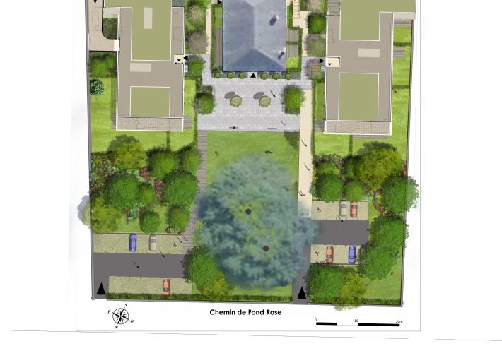 Du nord au sud de la parcelle, des espaces verts communs jusqu’aux jardins privés pour les résidents. L’aménagement de l’ensemble d’habitation est centré sur un parvis, lieu d’échange et de rencontre. Lorsqu’on s’éloigne du parvis, un parc champêtre et fleuri s’offre à nous. Le parc possède deux majestueux cèdres de l’Atlas centenaires.